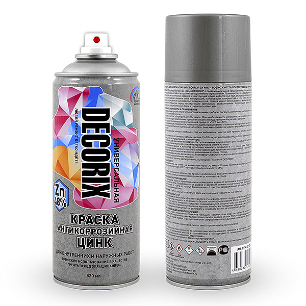 Высококачественная краска DECORIX® с содержанием цинка 48% предназначена для длительной защиты металлических поверхностей от коррозии и декоративного окрашивания. Применяется для окрашивания и антикоррозийной обработки металлических изделий и конструкций: крыш, водосточных труб, резервуаров, наружных отливов, оград, кованных изделий, сварных швов конструкций, консервации поверхностей и т. п., в том числе ремонтного окрашивания повреждённых оцинкованных поверхностей.